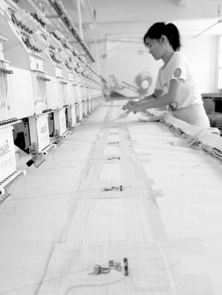 江西省分宜县种植苎麻及纺织中国独有“夏布”的历史长达上千年,被誉为“中国夏布之乡”。2009年5月,江西恩达家纺有限公司通过江西省信用担保股份有限公司向江西省新余农村合作银行争取贷款共3000万元,保证了生产、物流运输、研发设计等各环节的领先优势,顺利通过了上海世博会事务协调局的严格审查,于2009年8月31日取得授权书正式成为上海世博会特许生产商。图为工人在夏布制造流水线上工作。 周 密摄(新华社发)