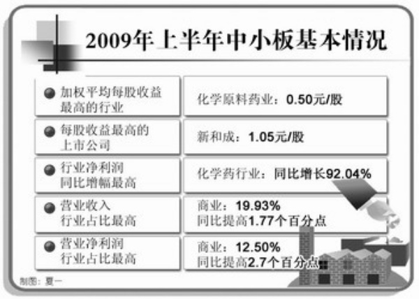 上半年,全部290家中小板上市公司实现营业收入1751亿元,同比下降2.1%;实现净利润127.2亿元,同比下降11.87%。分季度看,有可比样本的273家公司一季度完成净利润45.68亿元,二季度完成72.5亿元。全部290家中小板上市公司加权平均每股收益0.179元,新和成创下了每股收益的最高纪录,基本每股收益达1.05元。