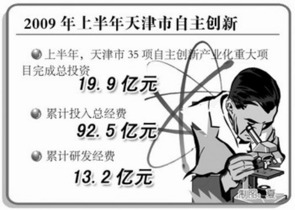 上半年,天津市35项自主创新产业化重大项目完成总投资19.9亿元,累计投入总经费92.5亿元,累计研发经费13.2亿元。目前,已有39个子项实现产业化,上半年完成销售收入58.2亿元,利税7.15亿元,累计实现销售收入130.3亿元,完成利税15.2亿元。自主创新成为拉动天津经济持续发展的重要引擎和增强核心竞争力的有效法宝。