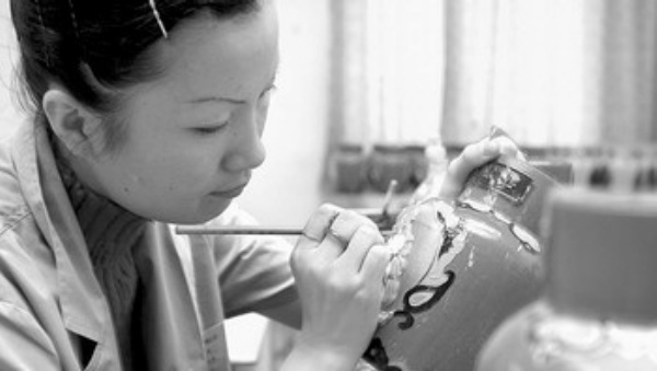 花雕酒是集绘画、书法、雕塑、文学、酿酒于一体的独特产品,极富地域特色,是中国文化名酒的典型代表。如今,工艺花雕的演示已成为古越龙山工业旅游的一个金牌项目。图为工艺师在手绘花雕。 袁 云摄