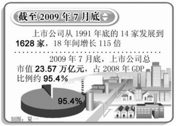 截至2009年7月底,上市公司家数1628家,沪深股市总市值23.57万亿元,流通市值11.67万亿元,市值全球排名第3位。上市公司总市值占2008年我国GDP比例约95.4%。