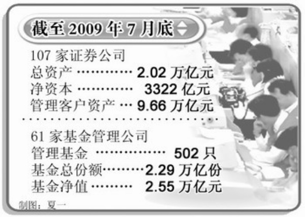 经过多年的发展,证券中介机构规范化程度明显提高,逐步纳入创新发展的新轨道。截至今年7月底,107家证券公司总资产2.02万亿元,净资本3322亿元,管理客户资产9.66万亿元,1—7月证券公司累计实现净利润578亿元。截至今年7月底,61家基金管理公司共管理502只基金,基金总份额2.29万亿份,基金净值2.55万亿元。