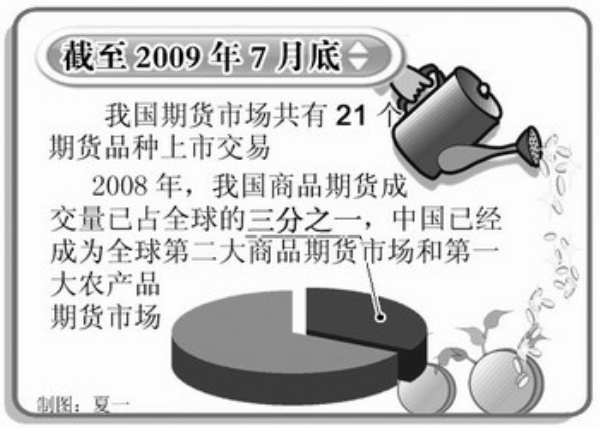 期货市场稳步发展,市场功能不断发挥。关系国计民生的大宗商品期货交易品种体系初步形成,金融期货产品也在积极准备。截至今年7月底,我国期货市场共有21个期货品种上市交易。去年,我国商品期货成交量已占全球的三分之一,我国已经成为全球第二大商品期货市场和第一大农产品期货市场。