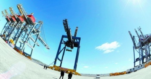 10月13日,从中国进口的集装箱吊车矗立在乌拉圭蒙得维的亚港。蒙得维的亚港新集装箱码头竣工,乌拉圭总统巴斯克斯出席竣工仪式并剪彩。该码头长355米,水深14.5米,为巴西、阿根廷、巴拉圭和乌拉圭组成的南方共同市场的海运提供了更大的便利。 新华社发