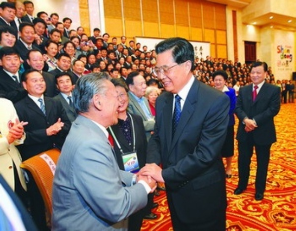 上图:十月十六日,中共中央总书记、国家主席、中央军委主席胡锦涛在济南接见新中国体育发展六十年来涌现出的优秀运动员、教练员代表和全国体育先进集体、先进个人代表。 新华社发