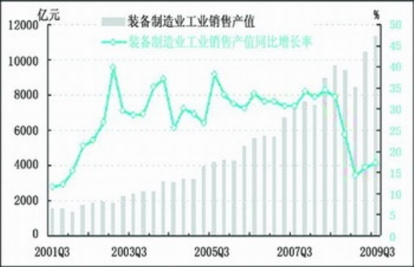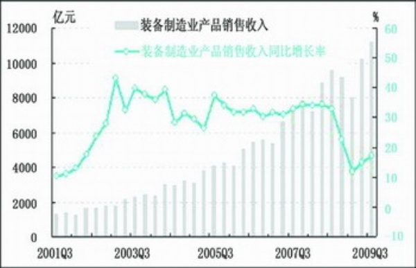 装备制造业工业销售产值同比增长率,从2009年一季度的最低增速14.3%逐步上升,呈现出稳步回升的态势。三季度专用设备和通用设备制造业的工业销售产值分别为4181.9亿元和7153.9亿元,专用设备制造业和通用设备制造业生产逐渐复苏,行业生产规模逐步扩大。可见,各项宏观经济政策特别是《装备制造业调整和振兴规划》(以下简称《规划》)的出台对于装备制造业的需求具有一定的拉动作用。
