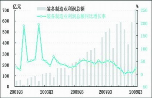 经初步季节调整,2009年三季度,装备制造业实现利润总额为714.1亿元,同比上升21.4%,增幅较上季度提高了19.0个百分点;环比上升21.3%,增幅较上季度减少了31个百分点。由于装备制造业产品价格以及销售情况均没有完全从低谷中恢复,致使其利润在最近两个季度上升幅度较小,预计装备制造业的利润还将保持一段时间的低迷。