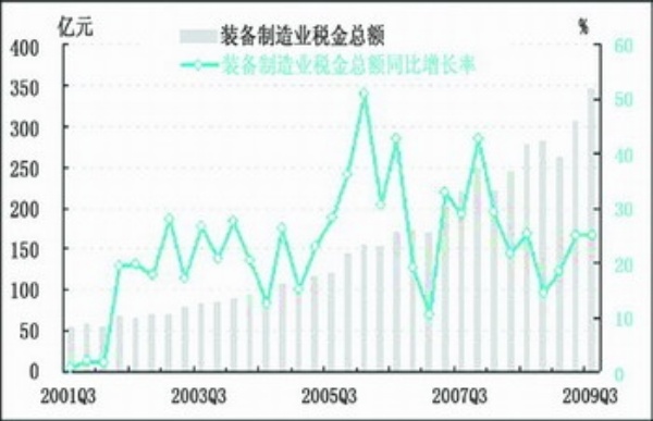 经初步季节调整,2009年三季度,装备制造业上缴税金总额为346.0亿元,同比上升25.0%,增幅较上季度提高了0.2个百分点;环比上升12.8%,增幅较上季度减少了4.1个百分点。其中,专用设备制造业的税金总额为126.0亿元,通用设备制造业的税金总额为220.0亿元,同比分别增长了28.4%和23.2%,增长趋势较二季度更为明显。这也从侧面反映了装备制造业企业的生产经营好转的速度在不断加快,整个行业正处于上升的通道之中。