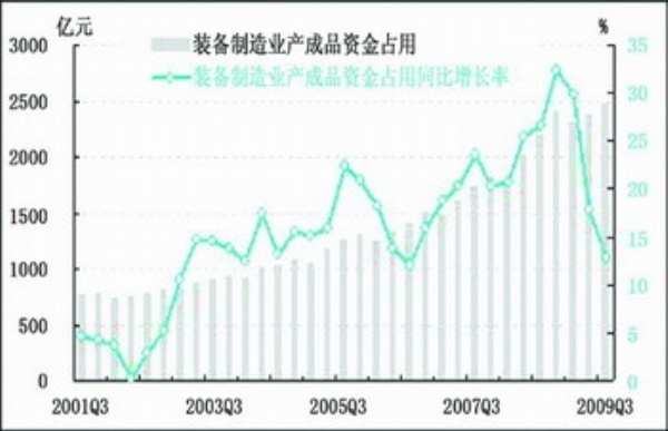 截至2009年三季度末,装备制造业产成品资金占用额为2478.7亿元,同比上升12.7%。2008年三季度末至2009年三季度末,装备制造业各季度产成品资金占用同比增长率分别为26.5%、32.3%、29.8%、17.8%和12.7%,连续5个季度保持产成品资金占用同比增长率不断下滑。