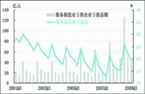 经初步季节调整,2009年三季度,装备制造业企业亏损额为38.1亿元,同比上升52.0%,增幅较上季度减少34.0个百分点;环比下降23.5%,降幅较上季度加大37.1个百分点。2009年三季度,装备制造业企业亏损面为19.1%,与上季度的亏损面相比回落了2.8个百分点,亏损企业的覆盖面有所下降,这说明,装备制造业亏损状况出现明显好转。