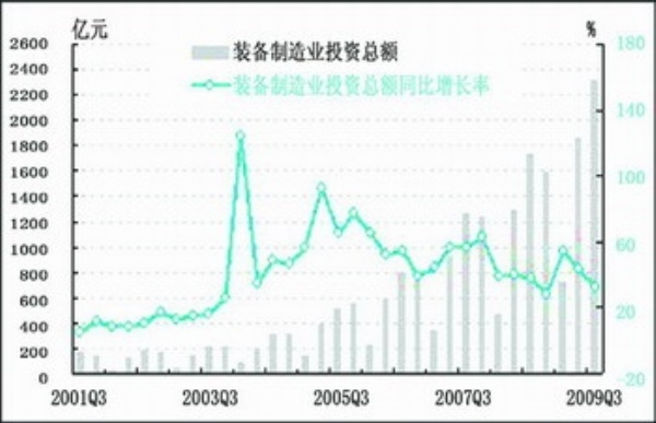 经初步季节调整,2009年三季度,装备制造业投资总额为2309.0亿元,同比上升33.0%,增幅较上季度减少10.7个百分点;环比上升24.1%,增幅较上季度减少134.5个百分点。