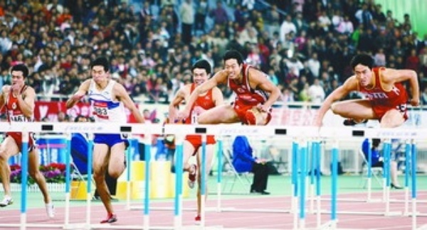 10月25日,上海选手刘翔(右一)在比赛中。当日,在第十一届全国运动会田径比赛男子110米栏决赛中,刘翔以13秒34的成绩成功卫冕,夺得冠军。 新华社记者 廖宇杰摄