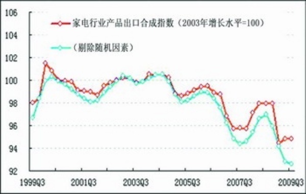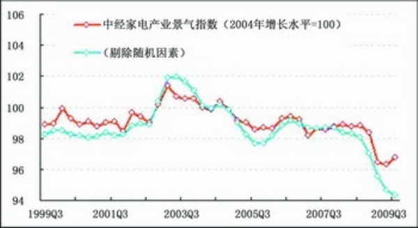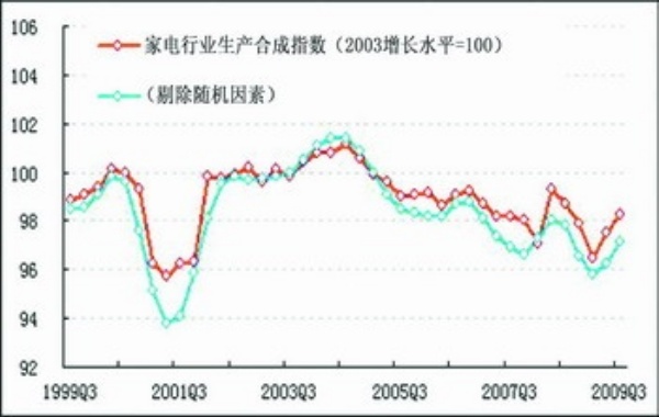 在进一步剔除随机因素后,三季度家电行业生产合成指数比上季度有所回升,但回升幅度较保留随机因素略弱(见图表中蓝色曲线)。由此可见,“家电下乡”、家电“以旧换新”等政策对家电行业生产的拉动作用较为明显。