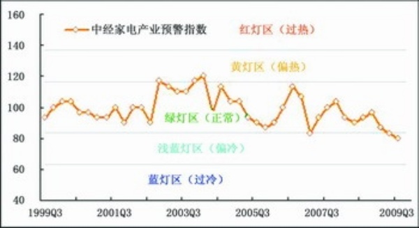 2009年三季度,中经家电产业预警指数为80.0点,与上季度相比下降3.3点⑥,回落到“浅蓝灯区”。