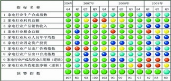 目前家电行业正处于恢复性增长阶段,一些主要指标同比增速已经开始回升,而其他指标虽然同比增速有所下降,但下降幅度均有所放缓。预计下季度,家电行业生产合成指数、家电行业产品销售收入、家电行业利润总额、家电行业从业人员、家电行业产成品资金占用和家电行业应收账款等6个指标同比(与上年同期比)增速将继续回升;家电行业出口合成指数有望出现转折企稳回升;家电行业固定资产投资和家电行业税金总额2个指标同比增速将继续回落。同时,在家电行业预警灯号中,家电行业生产合成指数有望由本季度的“浅蓝灯”转为“绿灯”;家电行业从业人员、家电行业出口合成指数有望由本季度的“蓝灯”转为“浅蓝灯”;其他指标则有望保持本季度灯号不变,从而使中经家电产业预警指数有望由本季度的“浅蓝灯区”回转至“绿灯区”运行。