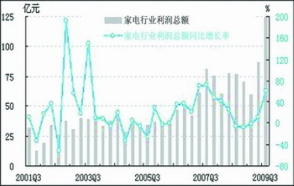 2009年三季度,经初步季节调整,家电行业利润总额为124.0亿元,同比增长61.0%,较上季度上升49.8个百分点;环比上升48.3%,较上季度下降0.2个百分点,仍保持强劲增长态势。其中,家用视听设备制造业利润总额为30.8亿元,同比增长44.4%,较上季度上升86.1个百分点;环比上升210.6%,较上季度上升234.8个百分点。家用电力器具制造业利润总额为93.2亿元,同比增长67.4%,较上季度上升41.4个百分点;环比上升21.6%,较上季度下降40.6个百分点。