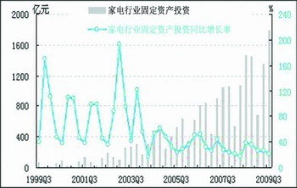 2009年三季度,经初步季节调整,家电行业固定资产投资总额为1786.7亿元,同比增长21.9%,增幅较上季度下降5.2个百分点;环比上升31.6%,较上季度下降64.4个百分点。