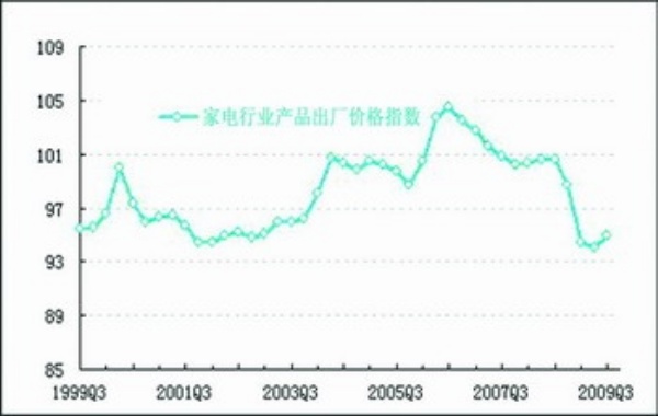 2009年三季度,家电行业产品出厂价格指数为95.0点,与上季度相比,上升1.0点,与去年同期水平相比下降5.6个点。