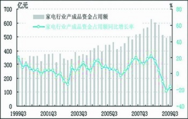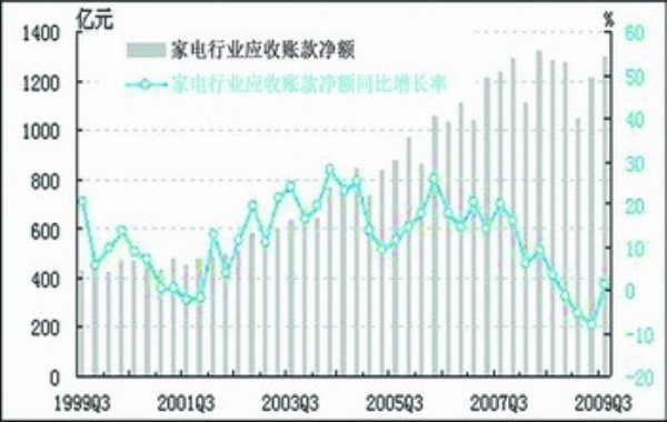 截止到2009年三季度,家电行业应收账款净额为1301.7亿元,同比增长1.3%,较上季度上升9.5个百分点。其中,家用视听设备制造业应收账款净额为523.9亿元,同比增长12.6%,较上季度上升19.7个百分点;家用电力器具制造业应收账款净额为777.8亿元,同比下降2.3%,较上季度上升5.9个百分点。