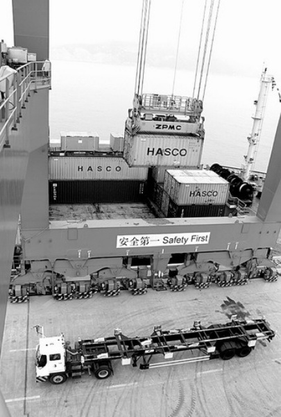 10月19日上午,搭载着14个集装箱货物的“晓星”号集装箱班轮,满载货物缓缓驶入温州状元岙港。由此,温州正式开通对台湾的海上直航。海上直航后,温州商品运抵台湾只需1天左右,每个集装箱的运输成本可以节省200美元左右。图为温州状元岙港的装卸现场。