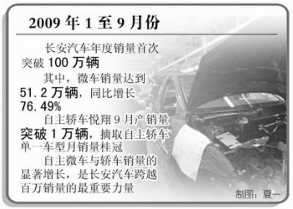 “大家见证的第600万辆新车交付正是我们的自主品牌轿车悦翔,这说明自主创新是长安汽车发展的一个重要根基。”长安汽车董事长徐留平认为,从长安旗下各品牌的销量来看,自主品牌的微车和轿车增幅最为突出,是长安汽车突破100万辆销量的主要动力。2009年,长安汽车“以微为本, 以轿为主”的发展战略进入纵深发展阶段,“微、轿”双双实现突破,是长安销量飞跃的关键所在,也是长安汽车增长的特色所在。