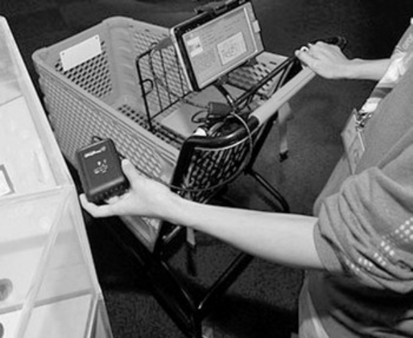图为在超市中使用的智能购物车。车把手上装有一台液晶显示器,消费者通过触摸屏提示,可总览商场内所有商品的购买信息。