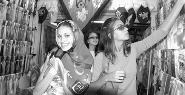图二为参加新丝路模特大赛的外国模特在杭州中国丝绸城挑选喜爱的商品。