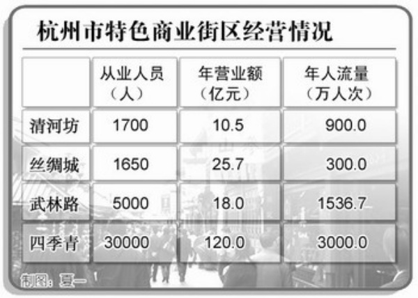同样是服装,四季青以批发为主,武林路以零售女装为主;同样是休闲,河坊街主打市井民俗的“俗”文化,梅家坞则主推茶文化休闲;文三路电子街时尚现代,丝绸城诗情画意。独特的定位是每条街区的优势,也是这些街区一炮而红的重要原因。