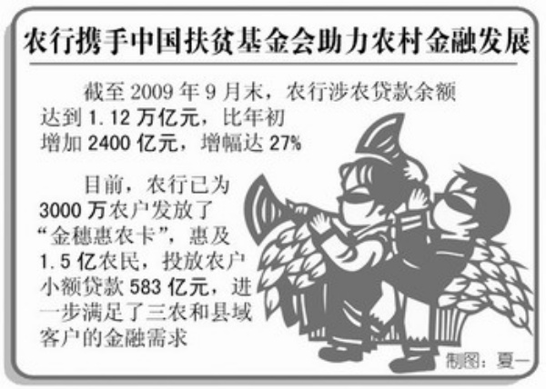 本报讯 农行与中国扶贫基金会日前在北京举行了授信签字仪式。根据协议的有关内容,由农业银行提供2亿元批发贷款,委托中国扶贫基金会下属的专业小额信贷机构向贫困地区的贫困农户提供小额信贷。 (刘 畅)