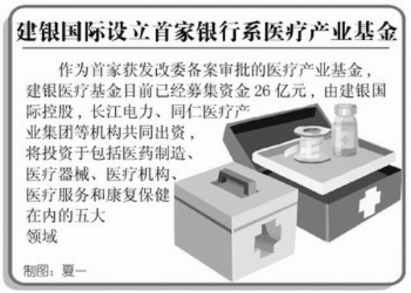 本报讯 中国建设银行的全资子公司建银国际日前设立了医疗产业基金,这是首家专注于国内医疗健康领域投资的银行系医疗基金。建行投资银行部总经理、建银国际董事长王贵亚表示,建银医疗基金的成立一方面出于看好医疗行业机会,另一方面也是建行转变业务模式和利润增长方式的结果。