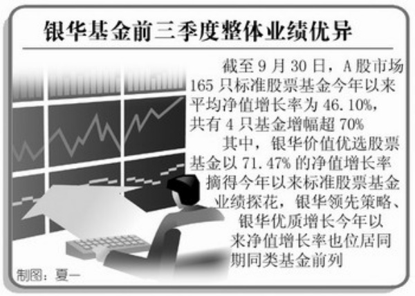 本报讯 据银河证券统计,截至9月30日,银华价值优选股票基金今年以来净值增长率为71.47%,列同期同类基金第3位。除了股票型基金业绩表现优异外,银华基金旗下债券基金、保本基金同样表现出色。据银河证券数据显示,截至9月30日,银华增强收益债券、银华保本增值混合前3季度净值增长率均在同期同类基金中位居榜首。