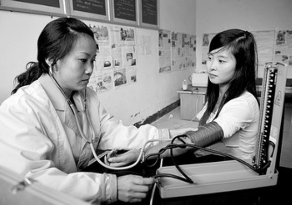 上图:近年来,山西大力发展农村基层医疗卫生体系,从软硬件设施上改善农村医疗状况。由乡镇统筹建设的诊所和由县级卫生部门定期派出的免费巡诊医疗队切实惠及了农村百姓。图为安泽县计划生育服务站的医务人员正在为安泽县小寨村居民进行健康普查。