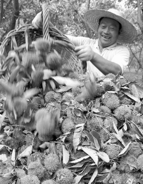金秋时节,山东郯城县7万亩板栗喜获丰收。近年来,该县组织林业,科技等部门帮助栗农实施老板栗良种科学嫁接、幼园矮化密植等技术增加产量,年产果800万公斤。产品畅销国内20多个省市,并出口韩国、日本等国家,年创汇1000余万美元。图为郯城县郯城镇归义西村村民正在收获板栗。