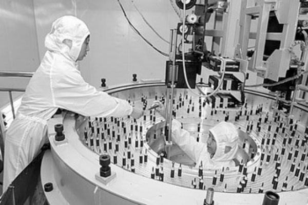 上图:北京正负电子对撞机重大改造工程利用广泛的国际合作渠道,引进国外先进技术和设备,建成国际上最先进的双环对撞机之一。图为科研人员在为主漂移室拉丝。