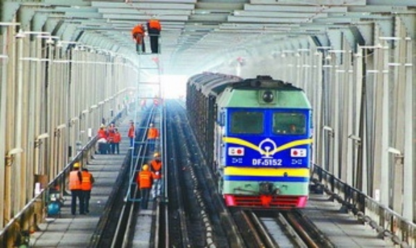 11月5日,施工人员在九江长江大桥铁路桥上调整电气化接触网。目前,京九铁路电气化改造工程已接近尾声,预计今年底可达到开通条件。 胡国林摄(新华社发)