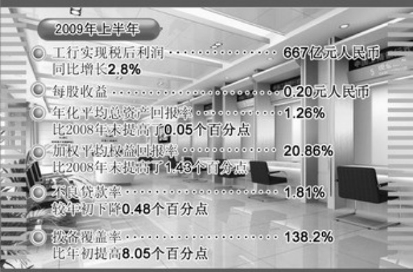 按照国际财务报告准则,2009年上半年工行实现税后利润667亿元人民币,同比增长2.8%;每股收益为0.20元人民币。股东的投资回报率持续增长,年化平均总资产回报率和加权平均权益回报率分别达到1.26%和20.86%,比2008年末提高了0.05个和1.43个百分点。与此同时,继续保持不良贷款余额和比例的双下降,截至6月末,不良贷款率降至1.81%,较年初下降0.48个百分点,拨备覆盖率已提高至138.2%,比年初提高8.05个百分点,抗风险能力进一步增强。