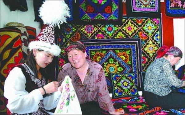 图4:新疆托里县托里镇喀拉盖巴斯陶社区的哈萨克妇女在刺绣民族饰品,该镇有五分之一以上的妇女从事传统刺绣工作,人均年创收1万余元。
