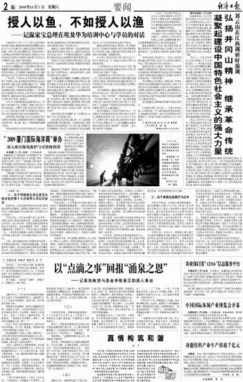 “谢谢你的邀请,”温家宝很认真地回应道,“信息技术日新月异。我希望中国企业不仅遵守当地的法律、讲诚信、搞好管理,同时也要把先进的技术和经验传授给当地企业和员工。我们常讲‘授人以鱼,不如授人以渔’。你们说对吗?”