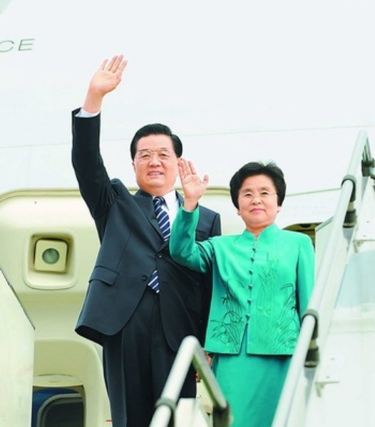 上图:十一月十日,国家主席胡锦涛抵达吉隆坡,开始对马来西亚进行国事访问。这是胡锦涛主席和夫人刘永清在机场向欢迎人群挥手致意。