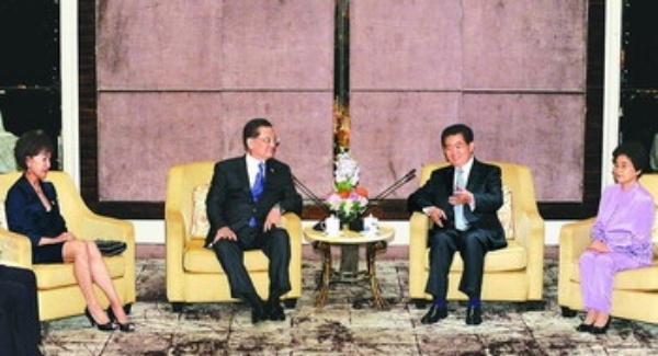 十一月十四日,中共中央总书记胡锦涛和夫人刘永清在新加坡会见中国国民党荣誉主席连战和夫人连方 。