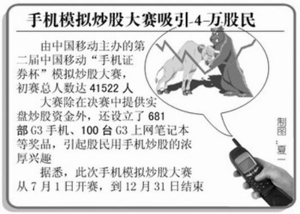本报讯 第二届中国移动“手机证券杯”模拟炒股大赛正在紧张进行,目前累计收益榜的冠军虚拟资产总额已逾百万,大赛决赛阶段主办方将提供600万元实盘炒股资金,资金的使用期为1个月,投资获益部分将归获奖者个人所有。 (徐 涵)
