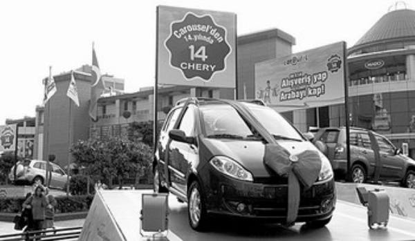 | 右图为11月14日在土耳其伊斯坦布尔卡鲁塞尔购物中心外展销的奇瑞汽车。当日,奇瑞汽车在土耳其举办促销活动。奇瑞汽车因物美价廉受到当地消费者的欢迎,需求量不断上升。