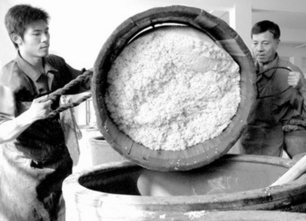 浙江古越龙山绍兴酒厂酿造车间,大学生学徒工邵峰(左)正在向老技师学习开耙发酵。该企业今年招聘了25名大学生学徒工,加强了企业传统酿造工艺的传承与发展。