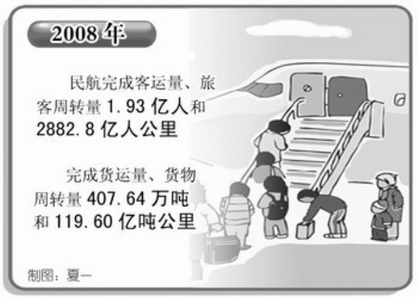 2008年,我国民航完成客运量、旅客周转量1.93亿人和2882.8亿人公里,是1949年的713倍和1558倍,年均分别增长11.8%和13.3%;完成货运量、货物周转量407.64万吨和119.60亿吨公里,是1949年的170倍和570倍,年均分别增长9.1%和11.4%。