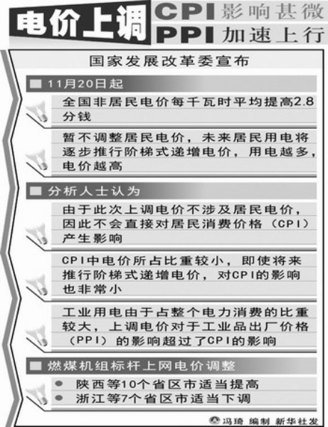 国家发展和改革委员会19日宣布自2009年11月20日起,将全国非居民用电销售电价每千瓦时平均提高2.8分钱。各地区、各行业电价调整标准有所差异。