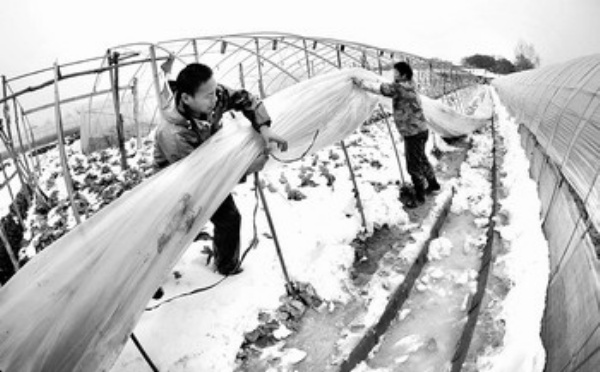 11月18日,芜湖菜农搭建蔬菜大棚。 一场早冬强降雪给安徽芜湖郊区蔬菜大棚带来灾害,当地农民正在积极展开生产自救,减少损失。 陈立希摄 (新华社发)