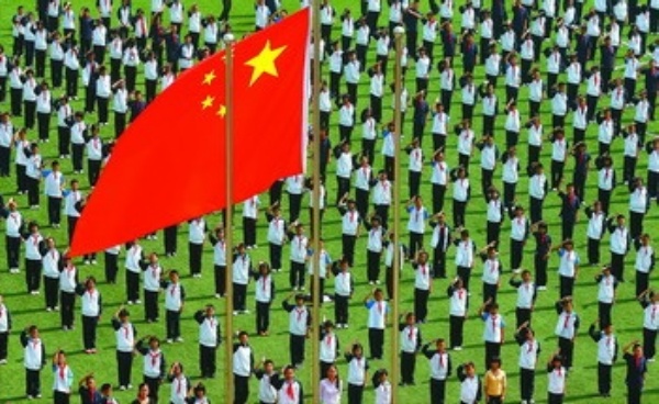 ①在都江堰市七一聚源中学,千名学生参加升旗仪式。