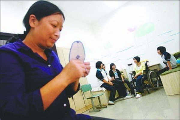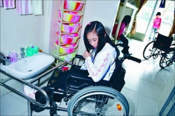 ②在都江堰友爱学校,一位地震致残学生正在寝室梳洗。
