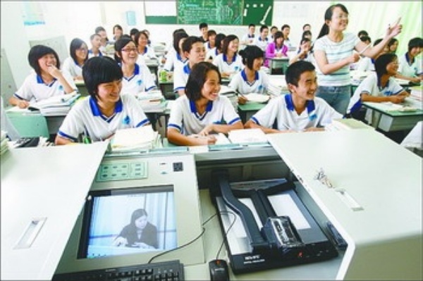 ⑥都江堰市八一聚源中学的远程网络直播教学班里,学生们正通过多媒体教学设备认真听百年名校成都七中高级教师高峥讲授的数学课。这个班的50名学生,每天都与成都七中同步授课,享受无缝对接的优质教学资源。