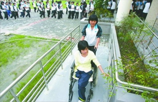 这是一所拥有无障碍设施的新学校。新学期,在都江堰市七一聚源中学,地震致残学生李露在母亲的陪伴下,开始了新的学习生活。为照顾地震致残学生起居,学校特许李露母亲住校陪读,还给李露母亲在学校安排了卫生保洁工作。